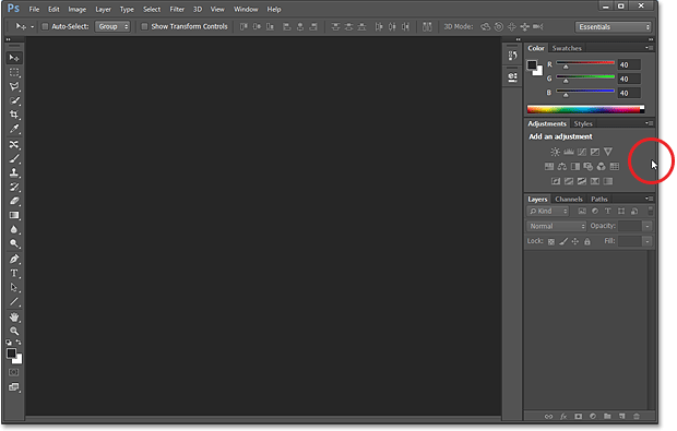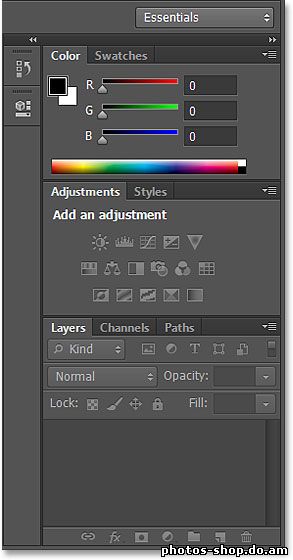 Когда мы сначала установить Photoshop, мы представлены рабочей по умолчанию, которая называетсяОсновы . Это своего рода рабочей области общего назначения, содержащего некоторые из наиболее часто используемых панелей, как Слои, Каналы, корректировки и истории, а также несколько других. Как мы узнали в уроке, панели расположены в двух колонках по правой части экрана.