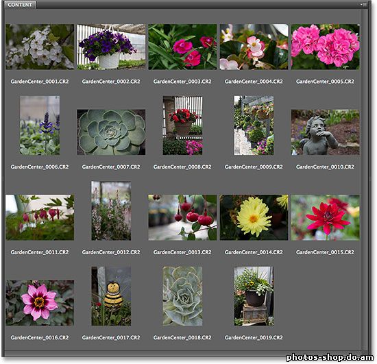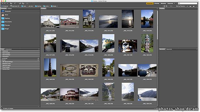 С помощью Adobe Bridge, открытым на экране, перейдите к папке на компьютере, содержащую изображения, которые вы хотите переименовать. Эскизы изображений внутри папки отображаются впанели содержимого в центре интерфейс Бриджа: